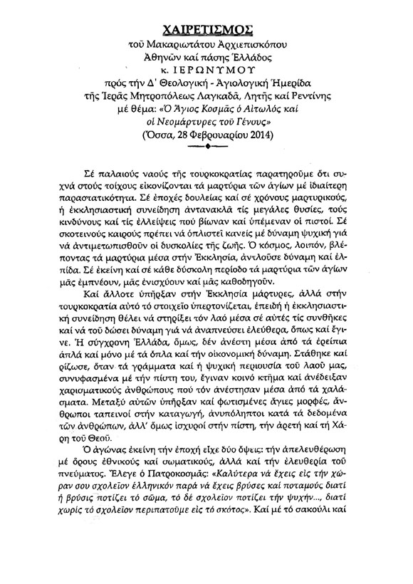 Χαιρετισμός του Μακαριωτάτου Αρχιεπισκόπου Αθηνών και Πάσης Ελλάδος κ.κ. Ιερωνύμου