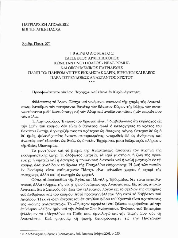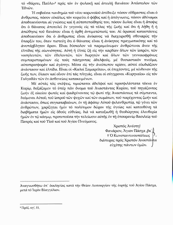 Πατριαρχική Ἀπόδειξις ἐπί τῷ Ἁγίῳ Πάσχα 2020
